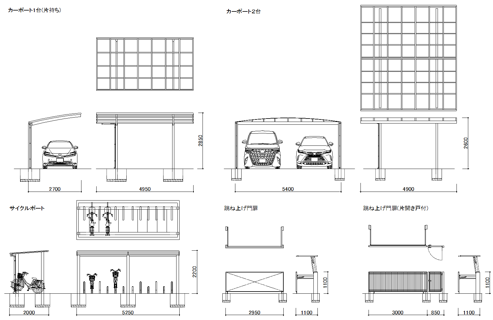 カーポート、跳ね上げ門扉、サイクルポートの平面図、立面図の一般図データです。メーカーの製品図は詳細で重く使用しづらい、またメーカーを指定せず一般的な寸法のデータが使いたいという方向けです