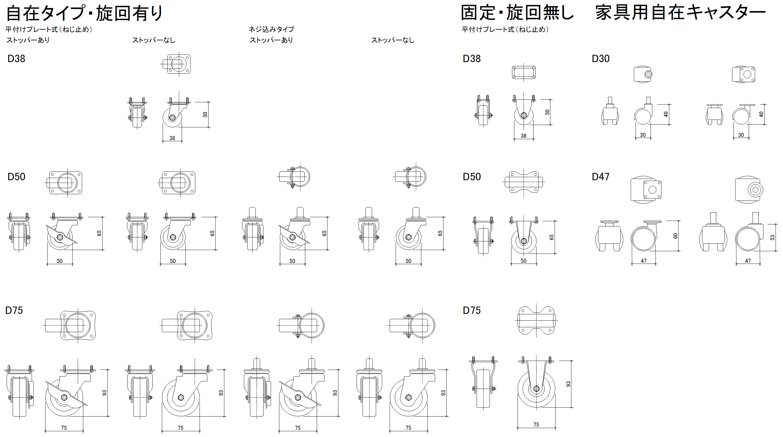 一般に使用頻度の高いキャスターの汎用図データです。メーカー既製品サイズ等を参考にした一般図です