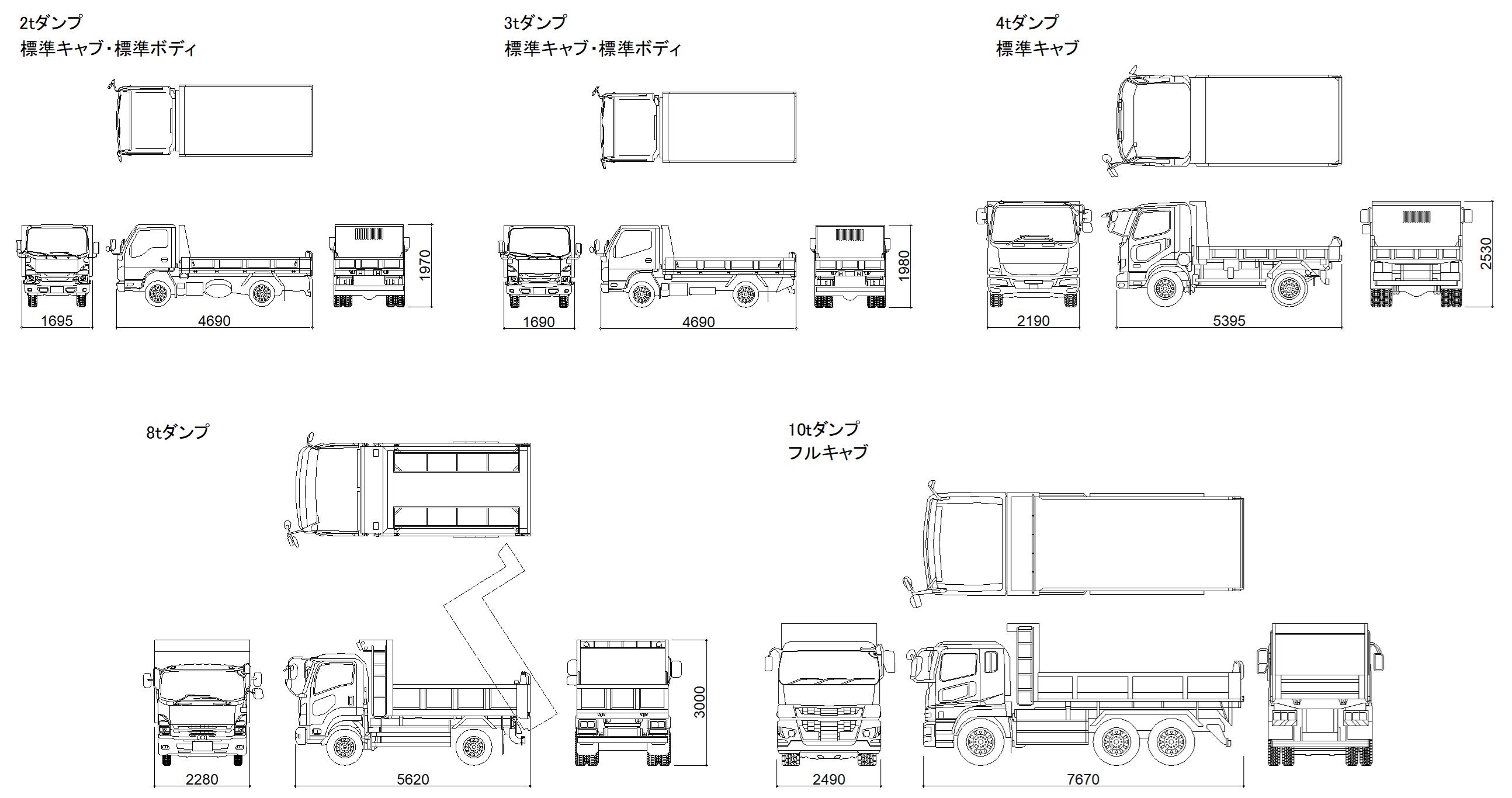 本データは、特定のメーカー製品を正確に再現したものではなく、国内メーカーを参考に作成した「汎用ダンプトラック」の一般図です。作図の際、キャビン形状等については、いすゞ、三菱ふそう各車の外形を参考にしていますが、ダンプトラックの仕様は一般的にキャブ形式、ボディ架装、アオリ形状により寸法は大きく異なります。またJIS等による規格寸法も存在しないため、本データはあくまで計画上の目安としてお取り扱いください。現場への搬入検討など詳細を要する際は、必ず実際に使用する車両の寸法・形状をご確認ください。