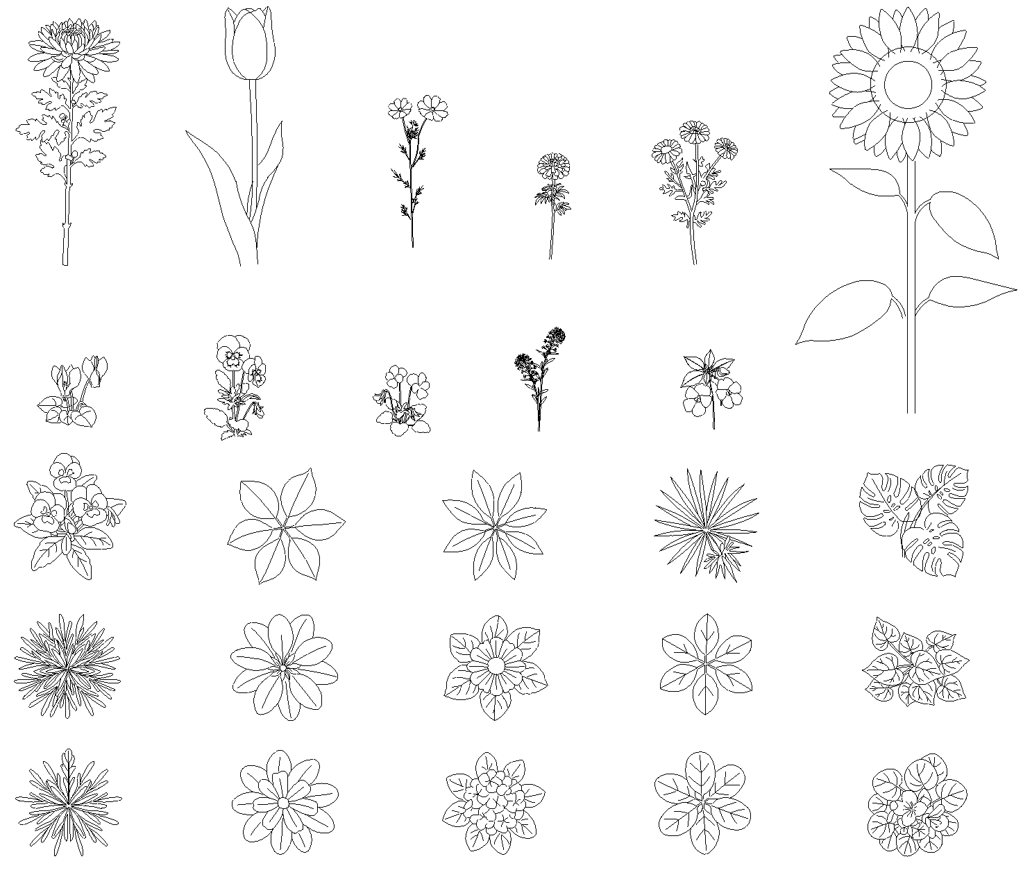 26種類の草花の立面図と平面図CADデータです