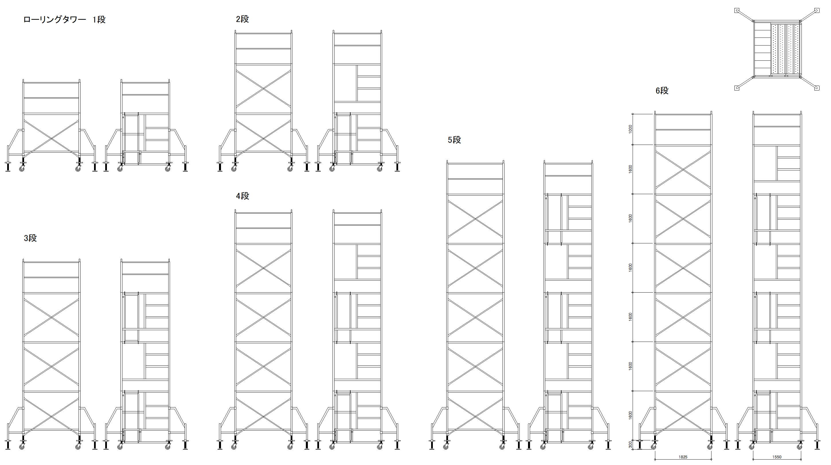 一般的なサイズのローリングタワー(可搬式足場)平面、立面の図面データです